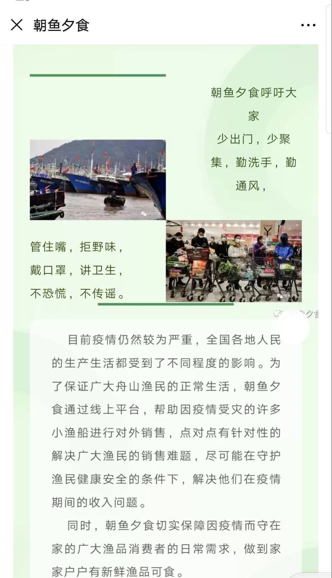 “朝鱼夕食”项目由沃瀚文同学及其团队创建于2018年初,成立之初,团队旨在解决小渔船的渔户销售困境,精准帮扶困境渔民,推动舟山小型渔船的海鲜行业的发展,从而响应乡村振兴战略。截至2019年底,该项目已与6艘渔船达成协议,同时与下沙地区多家需求方建立合作伙伴关系。本次“疫”线助农活动中,沃瀚文充分利用 “朝鱼夕食”创业项目平台开展线上工作,点对点帮扶小型渔船渔民解决疫情影响下的滞销困境,目前已取得一定成效。