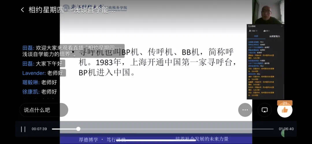 居家隔离,线上学习,学生的心理、学习状态都尤为重要。学院高琳老师以“如何提升自我”为主题,为同学们如何正确面对并适应疫情当前的居家学习提供了具体可行的方法,并嘱咐同学要学会规划当下的学习和生活,从而给返校后的学习生活做好准备。