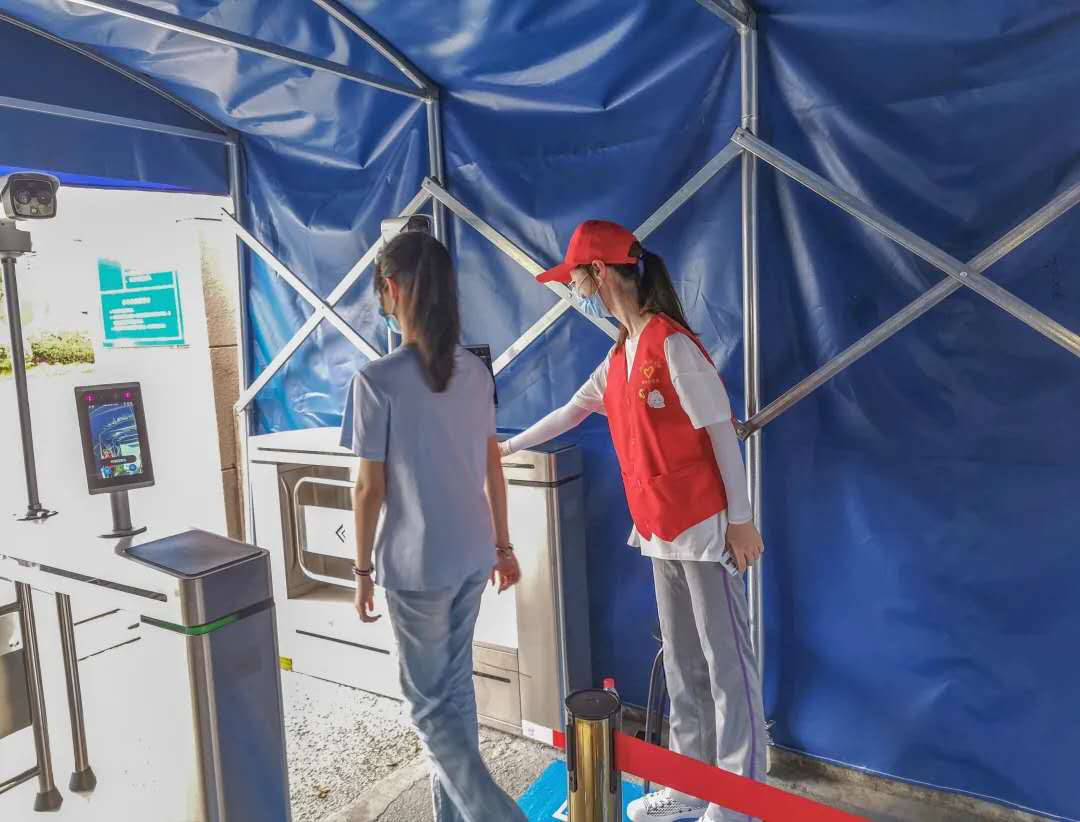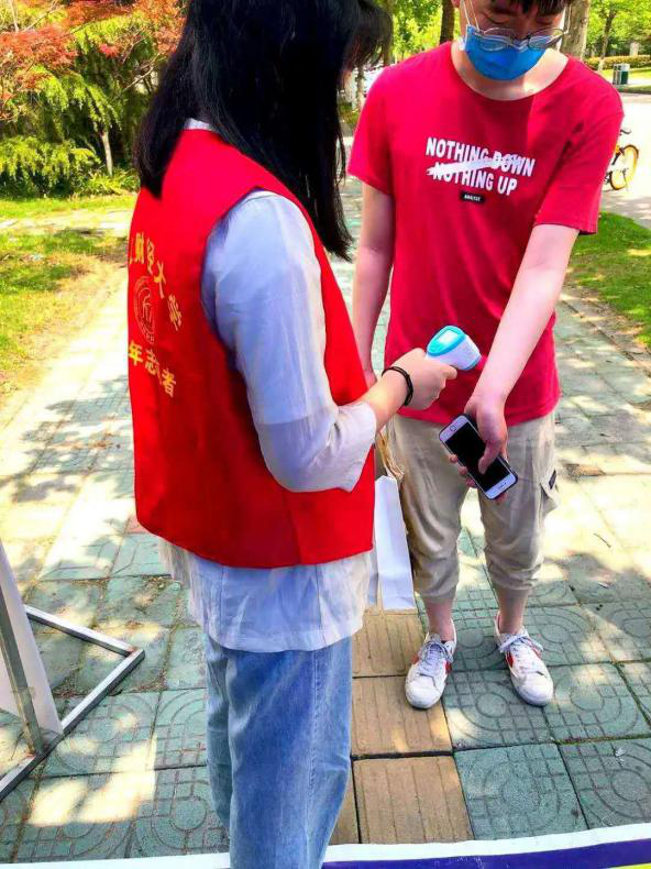 返校复学工作推进期间,教师党员志愿者朱音老师主动担任文海南路地铁站口的接站工作,引导学生测量体温、扫健康码,帮助学生提运大件行李,顺利搭乘学校的专线接站巴士。