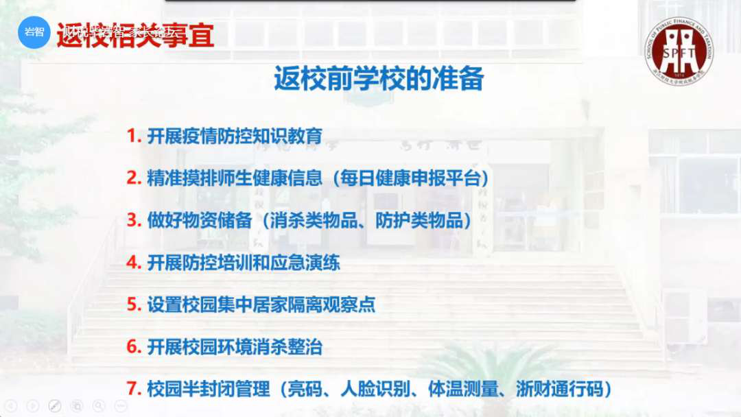 返校前,学院辅导员通过召开线上主题班会、重点地区学生“一对一”交流等方式,为学生详细解答复学复课、返校生活方面的各类问题。同时依托“杭州健康码”和“浙财通行码”,明确学生返校线上申请流程,分批次、分类别办理、审批返校申请。
