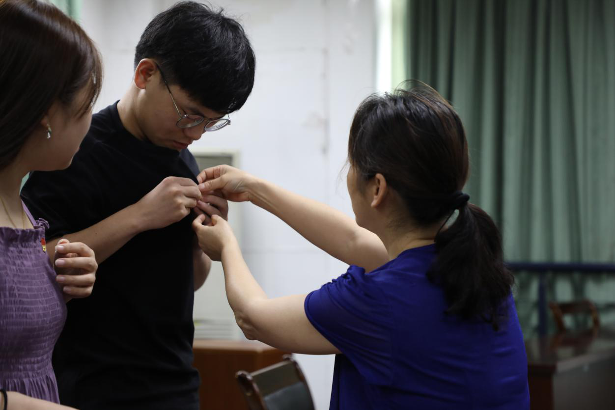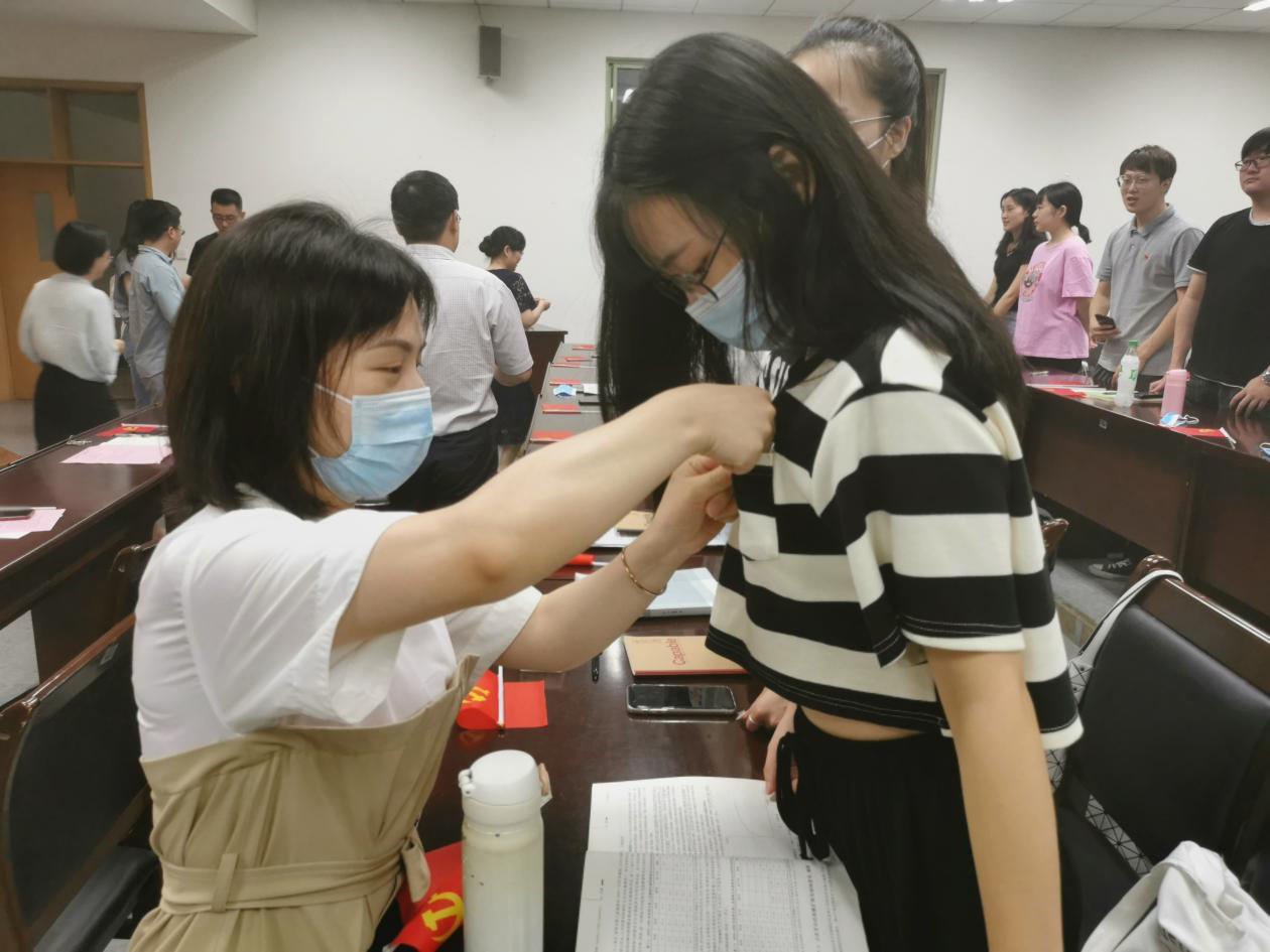 宣誓仪式后,学院领导和各支部书记为新发展党员佩戴党徽,逐一分发《中国共产党章程》和《中国共产党纪律处分条例》。