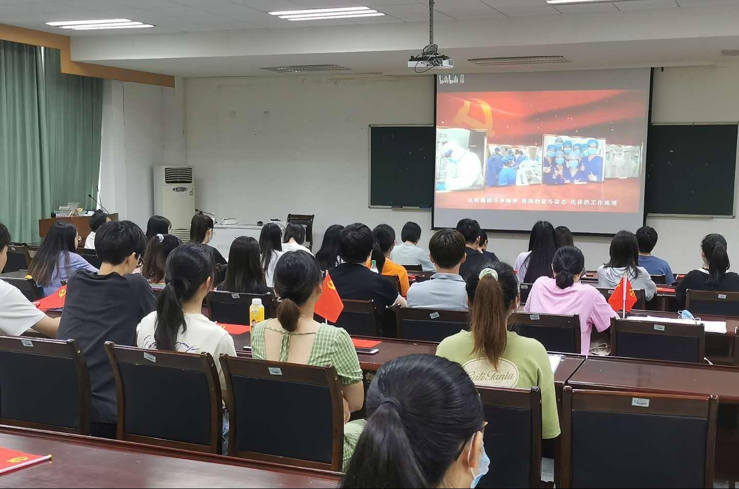 庆祝中国共产党成立99周年的宣传片,并聆听了高校党组织战“疫”示范微党课“七一”专题视频。