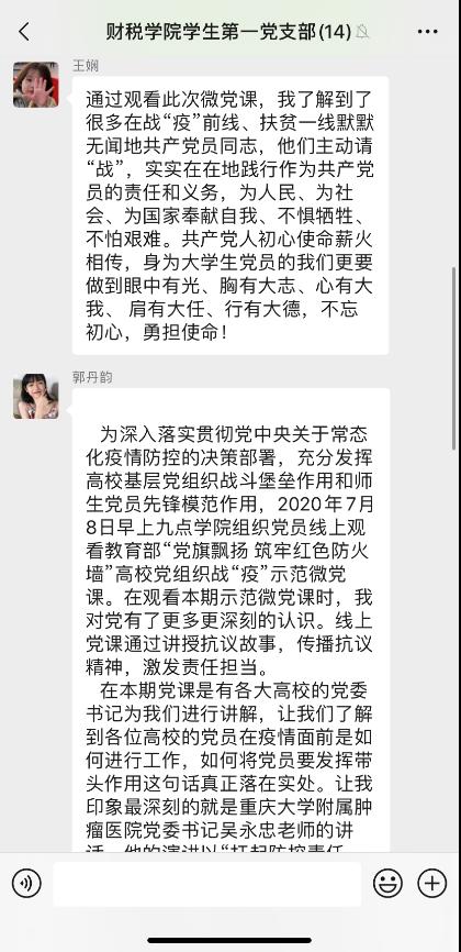 蔡锦程同志分享道:“在这次学习中,我了解到各个高校都用自己的方式在体现自己的价值,筑牢红色防火墙。例如北京航空航天大学的研究生付莹莹和她的团队们,在导师的带领下,开展基于大数据的疫情分析研究,为防控决策提供数据基础。为了更好更快地为疫情防控提供数据支撑,她和队员们分秒必争,从春节到春分,白天收集数据、训练模型、分析预测,晚上整理历史误差、撰写发布报告,召开线上会议。从她们身上我看到了青年大学生该有的模样。虽然我们只是一个普通的大学生,但我们也可以为这次疫情防控贡献自己的力量。回想二三月份的时候,我们村庄也开始了疫情管理。我虽然那时候不是党员,但我也是一个爱国的大学生,我主动请缨,在村口关卡执勤,用自己的切身行动证明我们新一代青年的力量。疫情防控的伟大斗争中,大批中国青年更应该展现自己的担当。”