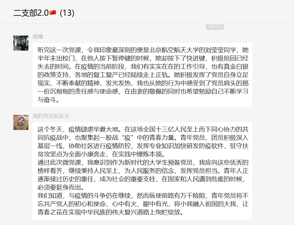 我支部同志下课后就本次学习展开了热烈的讨论。陈奕琦同志说:“我印象最深刻的便是北京航空航天大学的刘莹莹同学,她半年未出校门,在他人按下暂停键的时候,她却按下了快进键,积极抢回已经失去的时间……她积极发挥了党员自身立足现实、不断奉献的精神,发光发热,我也从她的行为中感受到了党员肩头的那一份沉甸甸的责任感与使命感,在由衷的敬佩的同时也希望勉励自己不断学习与奋斗。