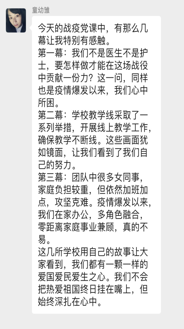 ➪童幼雏同志谈到:“今天的战疫党课中,有那么几幕让我特别有感触。第一幕:我们不是医生不是护士,要怎样做才能在这场战役中贡献一份力?这一问,同样也是疫情暴发以来,我们心中所困。第二幕:学校教学线采取了一系列举措,开展线上教学工作,确保教学不断线。这些画面犹如镜面,让我们看到了我们自己的努力。第三幕:团队中很多女同事,家庭负担较重,但依然加班加点,攻坚克难。疫情暴发以来,我们在家办公,多角色融合,零距离家庭事业兼顾,真的不易。这几所学校用自己的故事让大家看到,我们都有一颗一样的爱国爱民爱生之心。我们不会把热爱祖国终日挂在嘴上,但始终深扎在心中。”