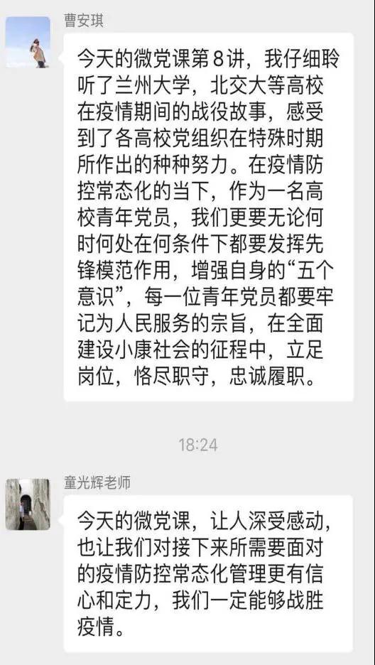 ➪曹安琪同志说:“今天的微党课第八讲,我仔细聆听了兰州大学、北交大等高校在疫情期间的战役故事,感受到了各高校党组织在特殊时期所作出的种种努力。在疫情防控常态化的当下,作为一名高校青年党员,我们更要无论何时何处在何条件下都要发挥先锋模范作用,增强自身的‘五个意识’,每一位青年党员都要牢记为人民服务的宗旨,在全面建成小康社会的征程中,立足岗位,恪尽职守,忠诚履职。”