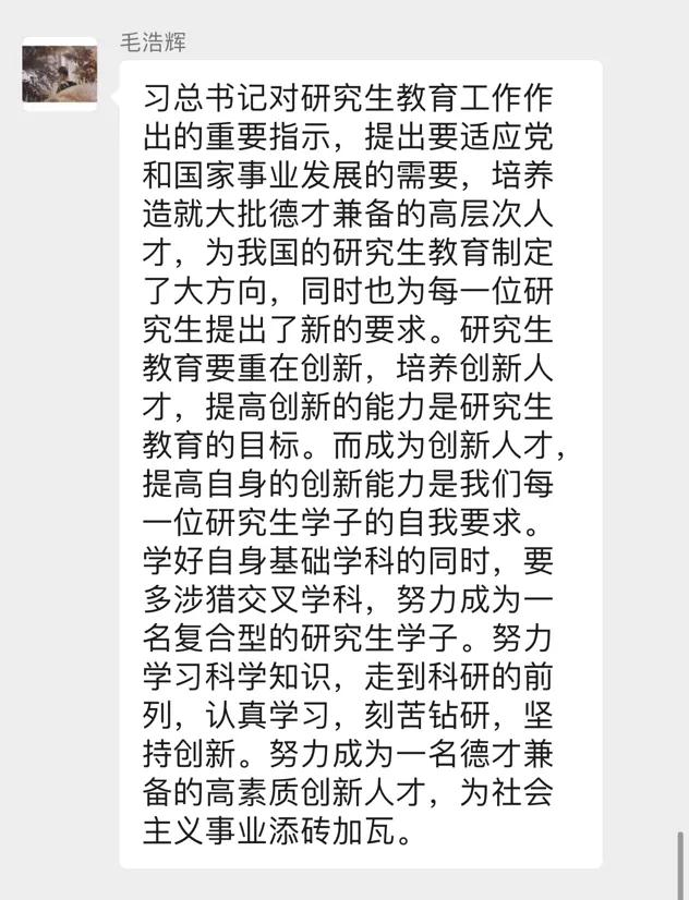 毛浩辉同志说:“习近平总书记对研究生教育工作作出的重要指示,提出要适应党和国家事业发展的需要,培养造就大批德才兼备的高层次人才,为我国的研究生教育制定了大方向,同时也为每一位研究生提出了新的要求。研究生教育要重在创新,培养创新人才,提高创新的能力是研究生教育的目标。而成为创新人才,提高自身的创新能力是我们每一位研究生学子的自我要求。学好自身基础学科的同时,要多涉猎交叉学科,努力成为一名复合型的研究生学子。努力学习科学知识,走到科研的前列,认真学习,刻苦钻研,坚持创新。努力成为一名德才兼备的高素质创新人才,为社会主义事业添砖加瓦。”
