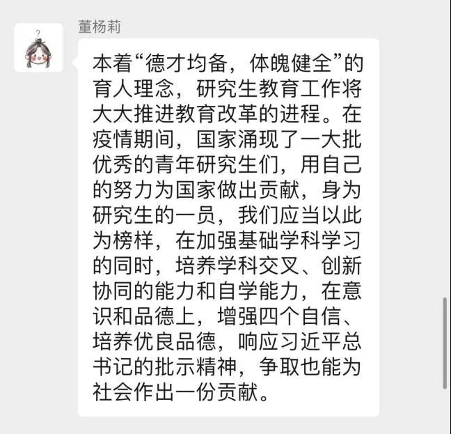 董杨莉同志认为:“本着‘德才均备,体魄健全’的育人理念,研究生教育工作将大大推进教育改革的进程。在疫情期间,国家涌现了一大批优秀的青年研究生们,用自己的努力为国家做出贡献,身为研究生的一员,我们应当以此为榜样,在加强基础学科学习的同时,培养学科交叉、创新协同的能力和自学能力,在意识和品德上,增强四个自信、培养优良品德,响应习近平总书记的批示精神,争取也能为社会作出一份贡献。”