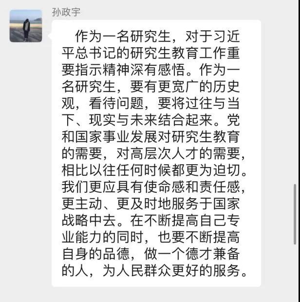孙政宇同志表示:“作为一名研究生,对于习近平总书记的研究生教育工作重要指示精神深有感悟。作为一名研究生,要有更宽广的历史观,看待问题,要将过往与当下、现实与未来结合起来。党和国家事业发展对研究生教育的需要,对高层次人才的需要,相比以往任何时候都更为迫切。我们更应具有使命感和责任感,更主动、更及时地为国家战略服务。在不断提高自己专业能力的同时,也要不断提高自身的品德,做一个德才兼备的人,为人民群众更好的服务。”