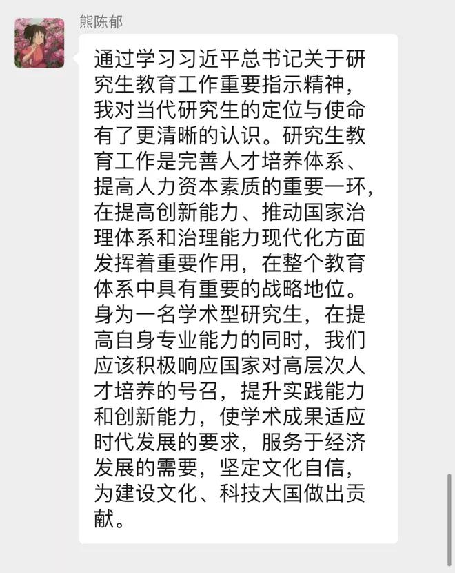 熊陈郁同志谈到:“通过学习习近平总书记关于研究生教育工作重要指示精神,我对当代研究生的定位与使命有了更清晰的认识。研究生教育工作是完善人才培养体系、提高人力资本素质的重要一环,在提高创新能力、推动国家治理体系和治理能力现代化方面发挥着重要作用,在整个教育体系中具有重要的战略地位。身为一名学术型研究生,在提高自身专业能力的同时,我们应该积极响应国家对高层次人才培养的号召,提升实践能力和创新能力,使学术成果适应时代发展的要求,服务于经济发展的需要,坚定文化自信,为建设文化、科技大国做出贡献。”