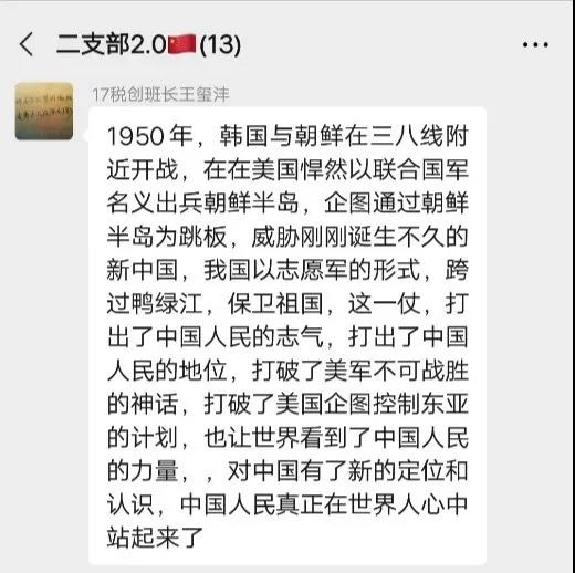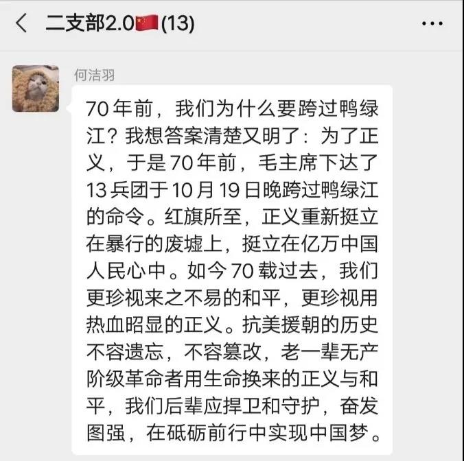 学生第二党支部在胡卓文书记的组织下召开线上支部会议,学习抗美援朝事迹及精神,交流感悟与心得体会。