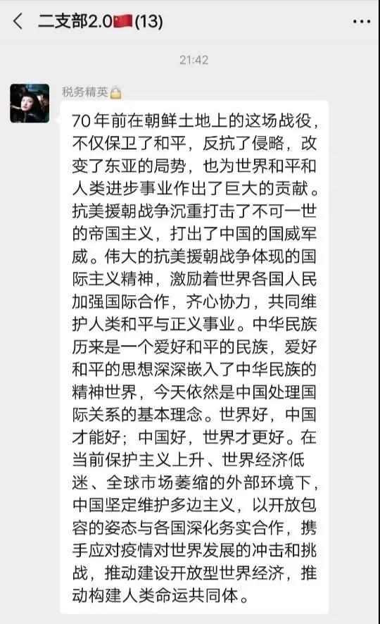 支部成员对10月19日习近平总书记在参观“铭记伟大胜利 捍卫和平主义——纪念中国人民志愿军抗美援朝出国作战70周年主题展览”的报道进行了学习,纪念胜利、告慰先烈,继承精神、展望未来。习近平总书记在参观展览时强调,要在新时代继承和弘扬伟大抗美援朝精神,为实现中华民族伟大复兴而奋斗。支部成员围绕习近平总书记的话展开了热烈的讨论。