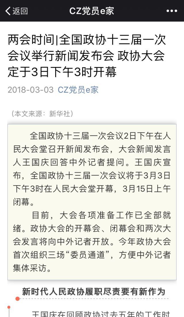 1.在党员公众号“CZ党员e家”上提前推送两会指南,引导学生提前关注两会。