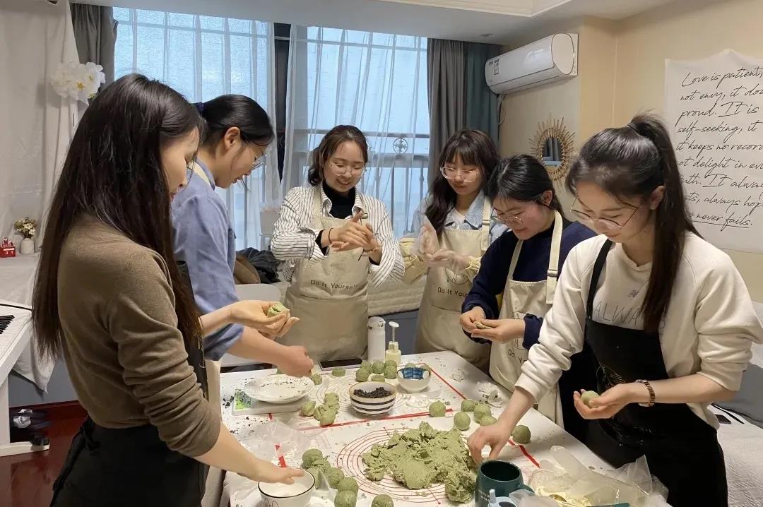 活动伊始,指导老师向大家讲解了青团制作知识,并亲手演示了青团的制作流程。在老师的指导和示范下,党员同志们动手体验,现场体验青团制作过程。为了庆祝建党百年,学生第三党支部党员们将精心包装的青团摆成了“党徽”+“100”的图形。