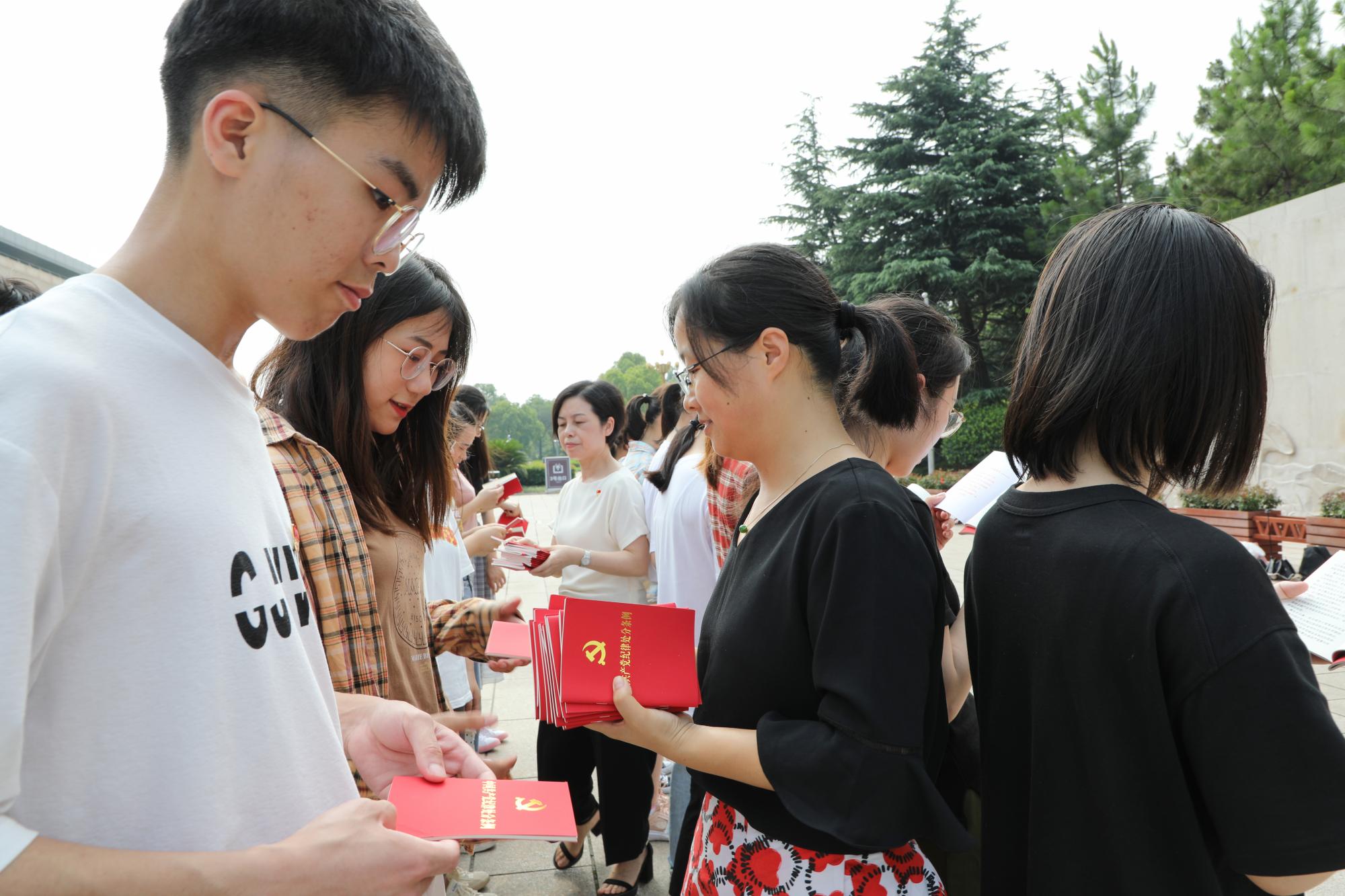 党委书记杨春玲带领全体党员庄严宣誓,重温入党誓词,并为新入党的近30名学生党员佩戴党徽,逐一分发《中国共产党章程》和《中国共产党纪律处分条例》。