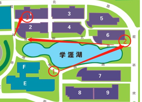 (1)本次健身走活动,起点设在学涯湖,终点设在财税学院,沿学涯湖共设3个固定点。如图:
