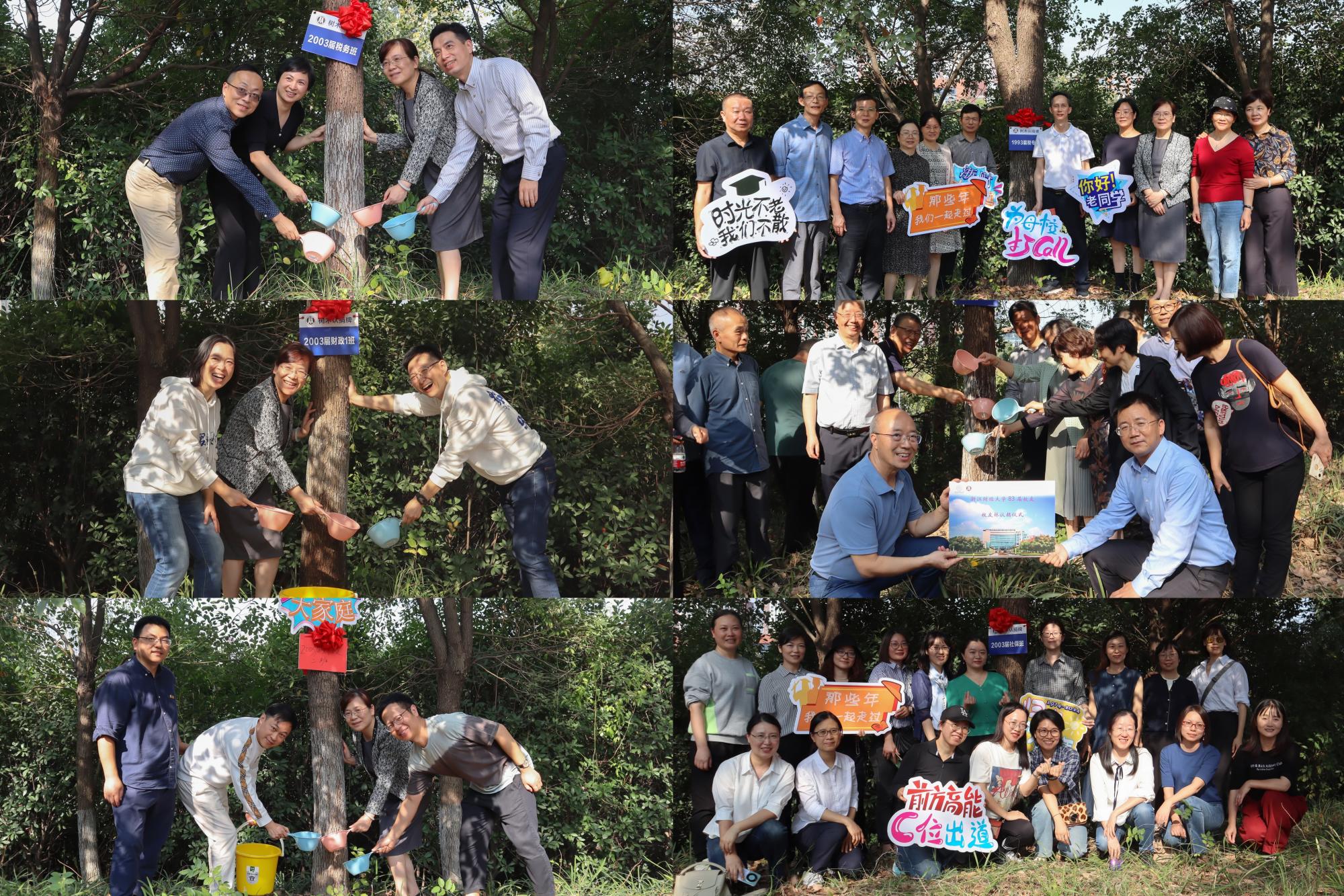 当天,学院还举办了“认领微心愿”活动暨星火基金年度总结会、红鹄思享汇和校友树木认捐仪式等活动。“认领微心愿”仪式上,广大校友积极参与认领,将拳拳爱校心转化为支撑学弟学妹们成长的切实行动,不断传递爱与温暖。在“红鹄思享汇”事迹分享座谈会上,优秀校友袁霞、沈沈壹作为主讲人分享了个人经验。袁霞校友通过强调精神富养的重要性,倡导同学们寻己所爱,发掘适合的人生模式。沈沈壹校友借助他一路向上的求学励志经历,鼓励正值青春的同学们不断奋斗。此外,学院还为1983届财政班、1993届税专班、2003届财政1班、2003届财政2班、2003届社保班、2003届税务班等6个班级举行了校友树木认捐仪式,学院领导与校友们一起挂牌浇水。一棵棵校友树承载着校友与母校的深情纽带,浓缩着校友对母校的由衷感恩,蕴含着对母校教育之树长青的真挚祝福。