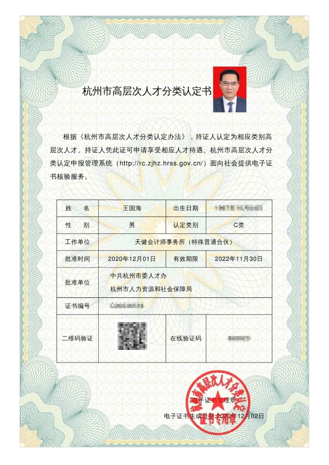 2020年12月2日,根据《杭州市高层次人才分类认定办法》相关规定,中共杭州市委人才办、杭州市人力资源和社会保障局批准认定天健会计师事务所党委副书记、副总裁王国海博士为杭州市C类高层次人才。