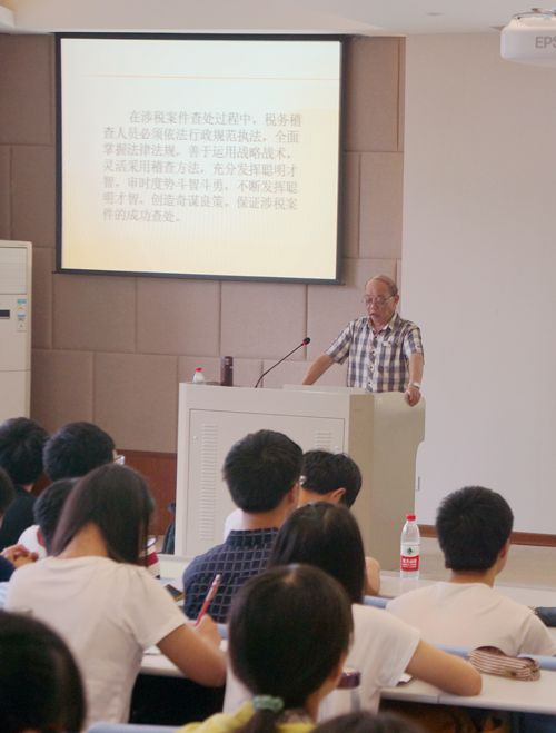 首先,池教授简要介绍了我国反偷税斗争的复杂性和艰巨性,并分析了目前常见的10种税收违法行为;随后,池教授介绍了11种税务稽查谋略;最后,池教授详细介绍了税务机关成功查处的3个偷税案例,它们分别是某企业骗取出口退税案、某纸业有限公司偷税案、某服饰企业偷税案。每一个案例均包括了税务机关查处过程、企业偷税手法和最终受到的处罚。池教授深入浅出的讲解给同学们留下了深刻印象。