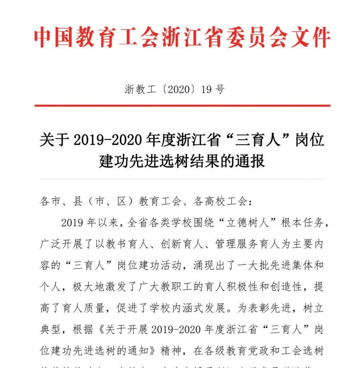 与其余172个单位和组织被授予2019- -2020年度浙江省“三育人”岗位建功先进集体。