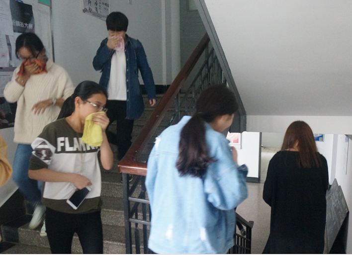 下午1点半,各寝室长先在楼下集合,接受消防安全教育,老师强调了平时要有规避火灾的意识,如出门要关掉电源、禁止使用大功率电器等。而后,老师又讲解了有关火灾现场的应急处置方案及消防疏散过程中的注意事项。下午3点半,紫元公司警卫们准备就绪,烟雾弹被点燃并冒出滚滚浓烟。随着警报声的响起,同学们迅速进入紧急疏散状态,大家用湿毛巾捂住口鼻有序地撤离寝室,楼层指导员在楼梯拐角指明疏散方向。整幢楼都烟雾缭绕,不少同学被呛得直咳嗽。学生到达目的地后,由寝室长确认人数并将结果报告给园区负责人。短短两分多钟,所有同学安全撤离,整个应急演练活动规范有序。同学们临危不乱、组织有序,逃生时没有发生拥挤、踩踏等意外事故。这种仿佛置身于真实火灾现场的经历,让在场的同学们都受益匪浅。最后,同学们在引导人员的的指挥下离开空地,本次演习圆满结束。