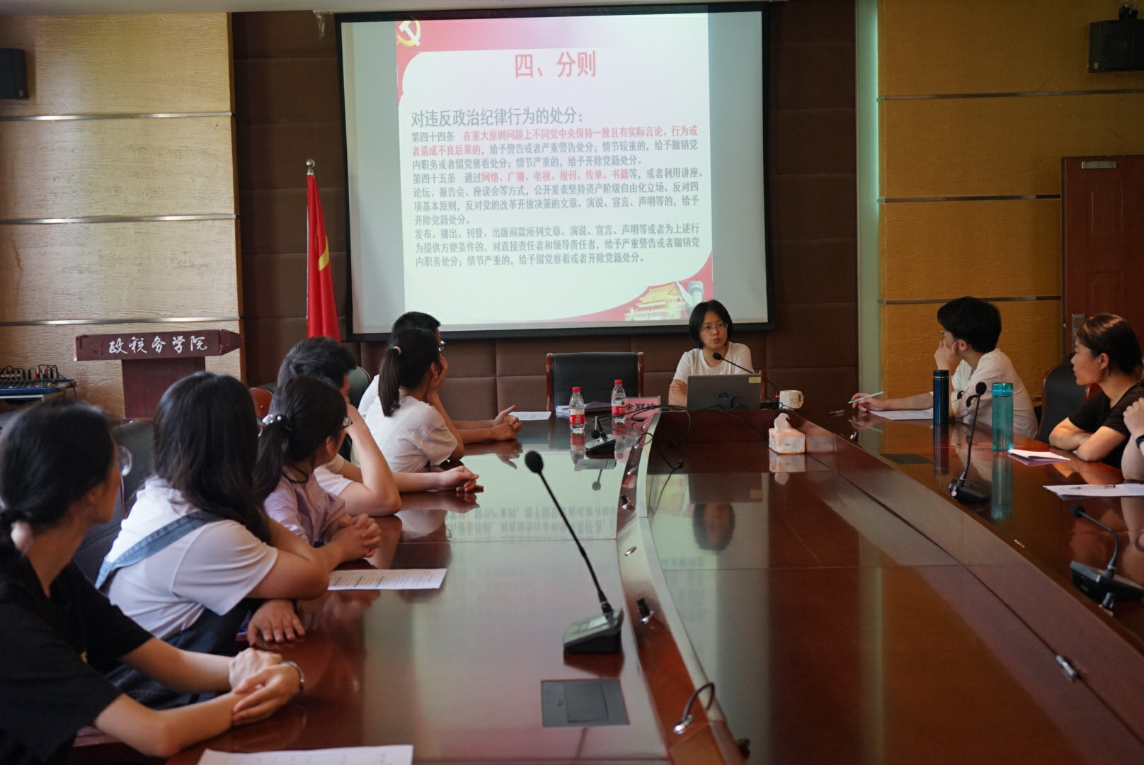 会议开始,党委副书记、纪委书记徐丽玲与全体成员进行了一次廉洁谈话,结合《中国共产党纪律处分条例》中的纪律要求进行规行矩步教育,针对谈话对象身份特点、思想认识,分析容易发生思想松懈和行为失范的情形,有针对地提出廉洁自律要求和努力方向,并就如何正确对待自己和他人,如何提高廉洁风险防控意识等问题展开了论述。最后,纪委书记徐丽玲对与会人员提出了三点要求:一是提醒大家提高思想道德修养,把牢人生底线,严于律己做有党性的合格党员;二是要求全体党员对新身份负责,定时对标标尺,躬身垂范作时代新青年的表率;三是期待毕业生静心崇廉,廉洁从学从业,走出干净的人生轨迹。
