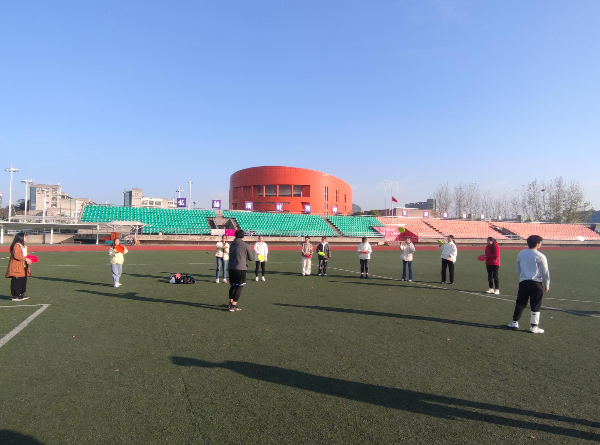 举行了红鹄益站之飞盘训练营活动,特邀学校“大盘鹅队”队员龚成章同学前来指导。