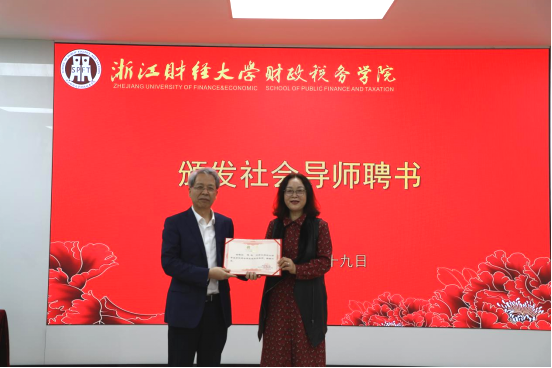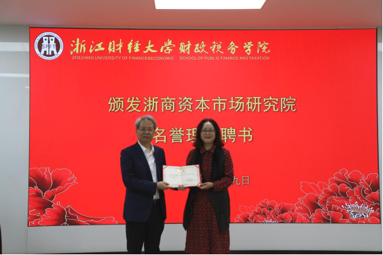副校长郑亚莉为陈敏副书记颁发社会导师聘书及浙商资本市场研究院名誉理事聘书。