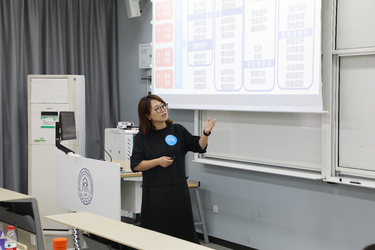 王婷老师结合“新文科”背景下数智时代《中国税制》的课程建设特点,从教学创新理念、创新特色以及创新路径三个方面,提出了课程的具体创新举措以及课程实践方法。在现场教学环节,王婷老师分别就《个人所得税——偶然所得》以及《财产转让所得的计税方法》进行了课堂展示,获得在场评委的一致好评。