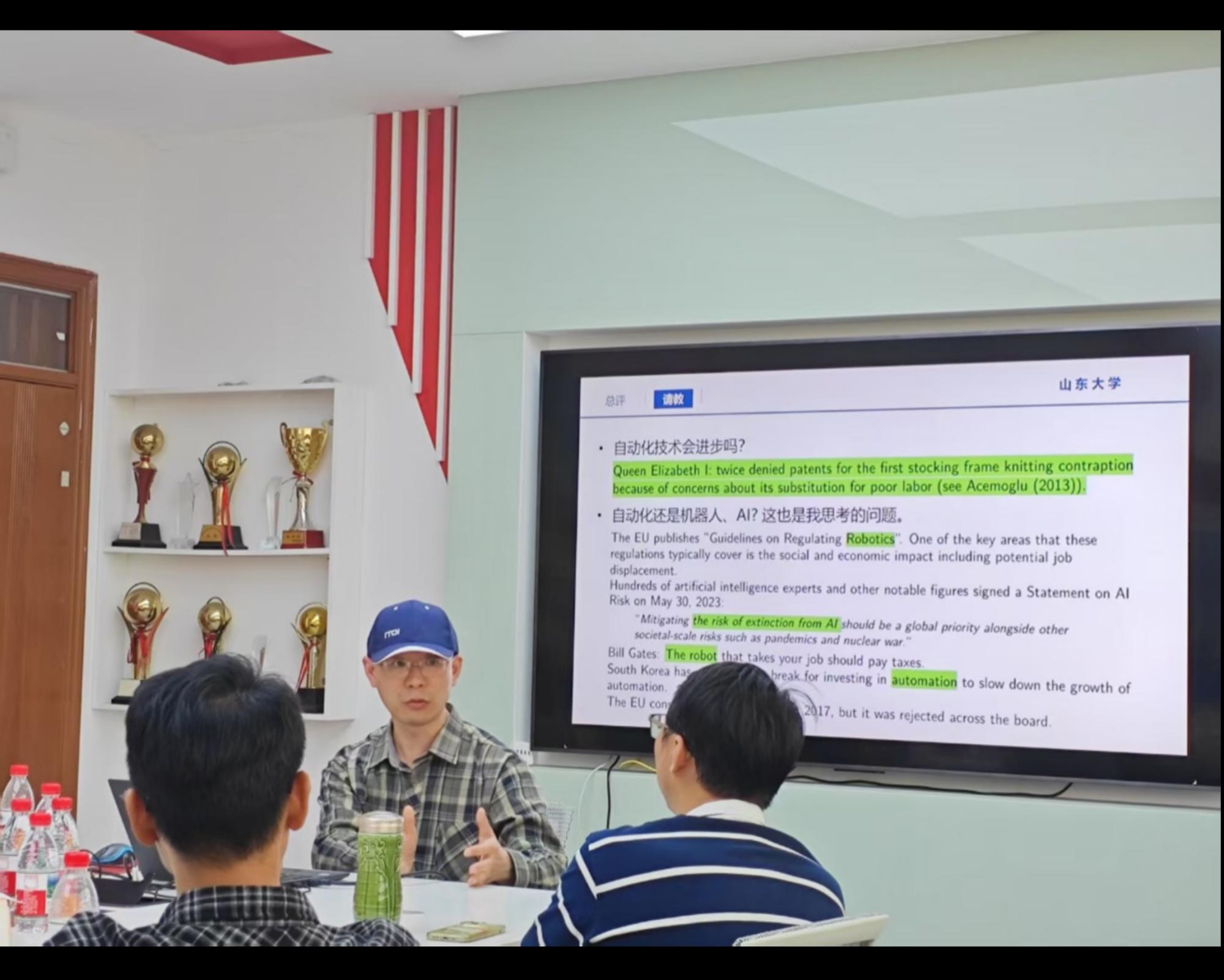 李太龙老师评价李文健老师的研究为“难得一见的扎实好文章”,并围绕多个维度展开深入追问:如何区分自动化与机器人、AI的概念,机器人税的本质及其与资本税的差异,以及自动化监管在经济学中的研究缺口。他强调需厘清模型核心逻辑,如任务分层(Task(z)与Task(i))的功能性差异,以及Case1与Case2的比较等。