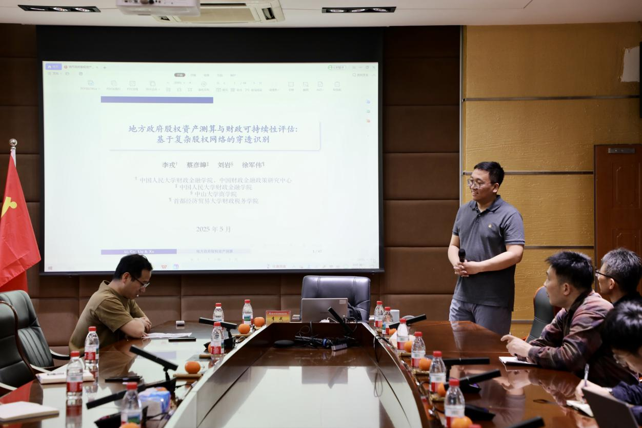 2025年5月12日上午,财税基础理论与政策双周论坛第3期在学院楼307室举行。本次论坛特邀中国人民大学财政金融学院教授、博士生导师李戎担任主讲嘉宾,聚焦“地方政府股权资产测算与财政可持续性评估:基于复杂股权网络的穿透识别”这一前沿主题。