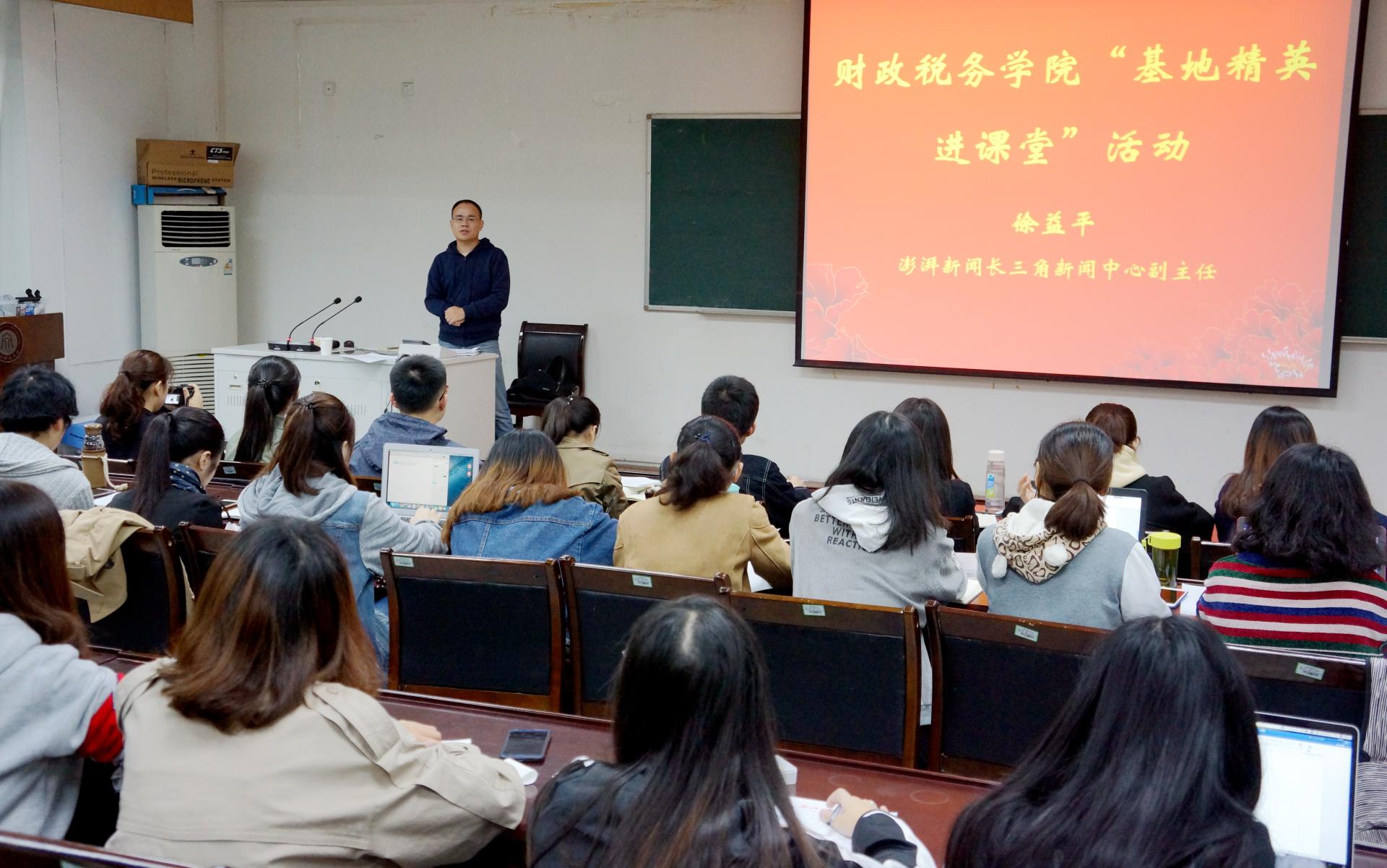 11月14日上午,澎湃新闻长三角起点中文网副主任徐益平老师应邀在财税学院楼106教室为14、15级财经新闻的同学做“财经新闻基地精英进课堂”系列讲座。讲座由《财经新闻报道》任课老师季陈翔主持,由主讲嘉宾徐益平老师以澎湃新闻三个成功的专题报道为例向学生们分享了澎湃是如何做大型深度报道的,现场反响热烈,互动不断。