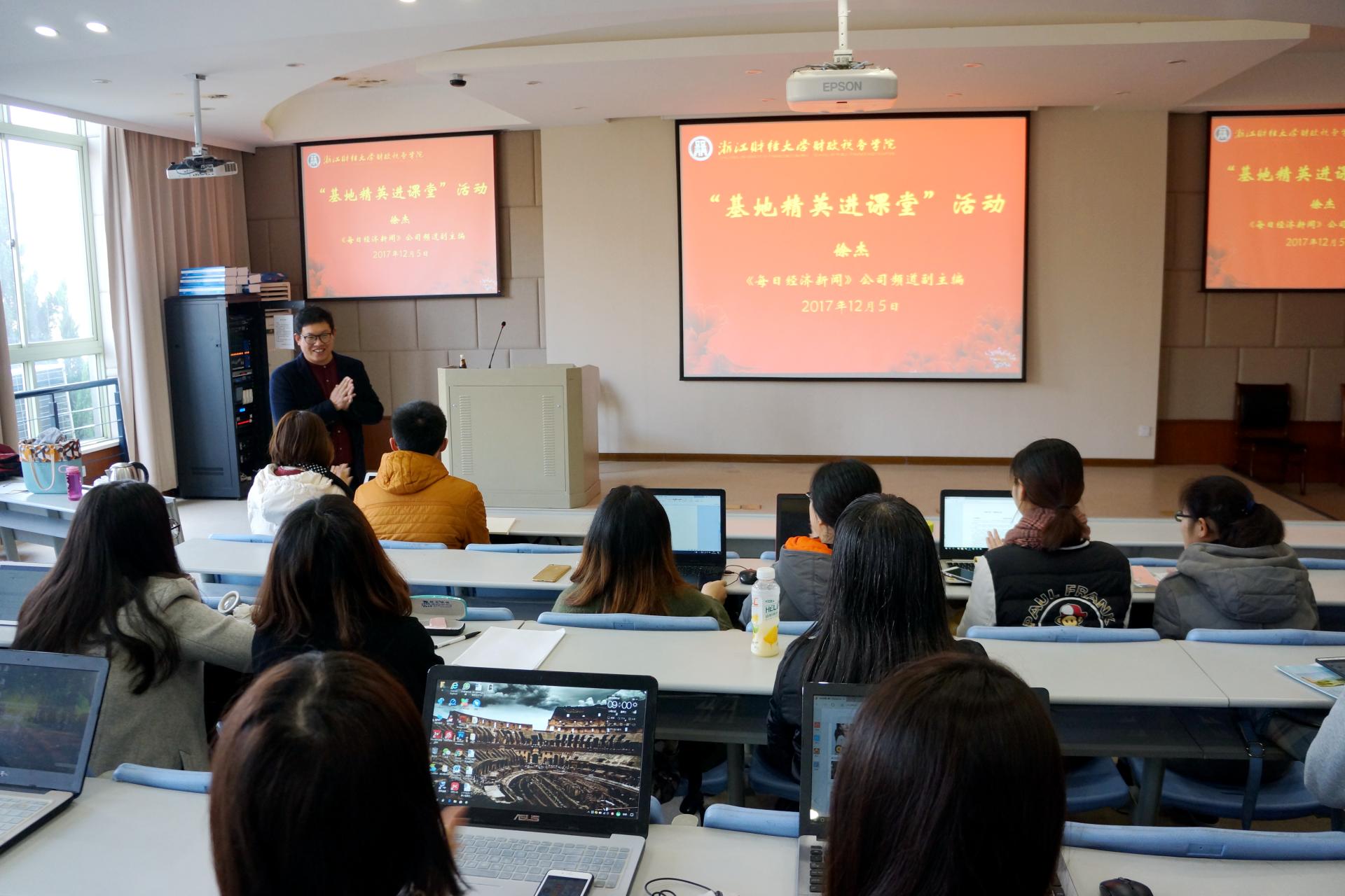 本网讯(通讯员 张慕秋 张雪)12月5日上午,《每日经济新闻》公司频道副主编徐杰先生应邀在财税学院楼208教室为财经新闻的学生做以“如何成为一名优秀的财经调查记者”为主题的“基地精英进课堂”的系列讲座。讲座由季陈翔老师主持,在场的老师和学生一起聆听了徐杰老师的精彩讲座,并进行了热烈讨论和交流,现场气氛活跃。