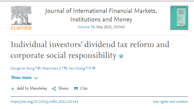 张帆副教授与合作者发表的研究论文《Individual investors’ dividend tax reform and corporate social responsibility》,在国际一流期刊《Journal of International Financial Markets, Institutions and Money》(JIFMIM)接受发表,该期刊为起点中文网