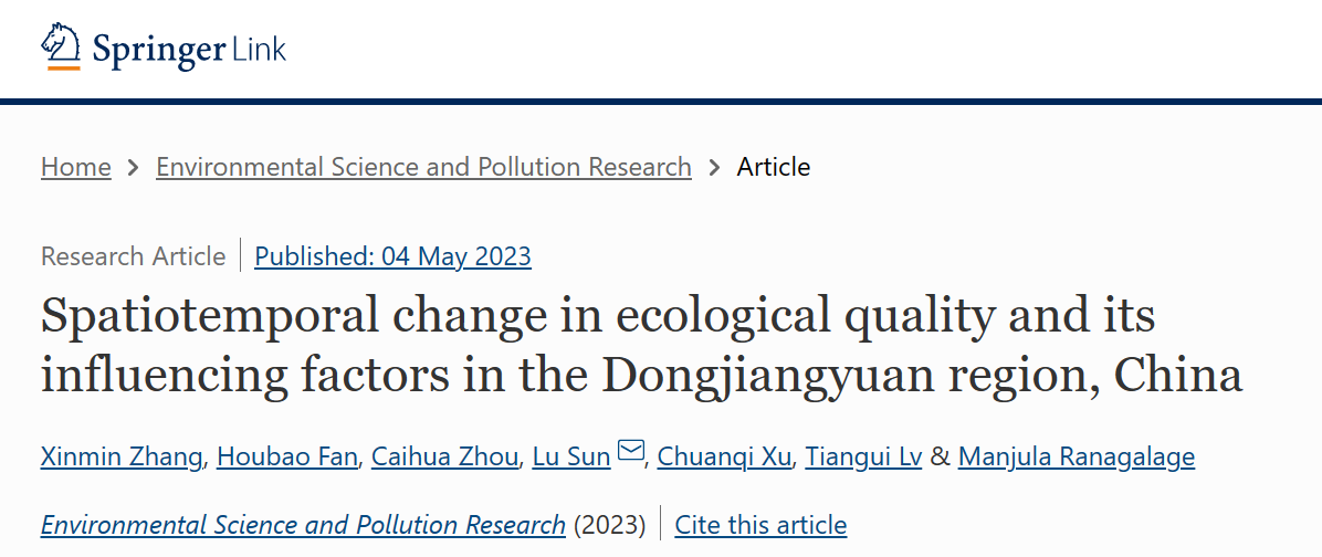 财税学院周材华博士,与江西财经大学生态文明研究院张新民博士等合作的论文《Spatiotemporal change in ecological quality and its influencing factors in the Dongjiangyuan region, China》在国际期刊Environmental Science and Pollution Research正式发表。