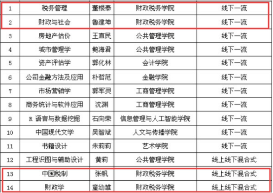 《财政学》、《中国税制》、《税务管理》、《财政与社会》4门课程分别入选省级线下、线上线下混合式一流课程,入选数目位居全校前列。
